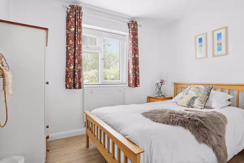 A charming front bedroom with a comfy small double bed, ample storage, and peaceful views over the garden.